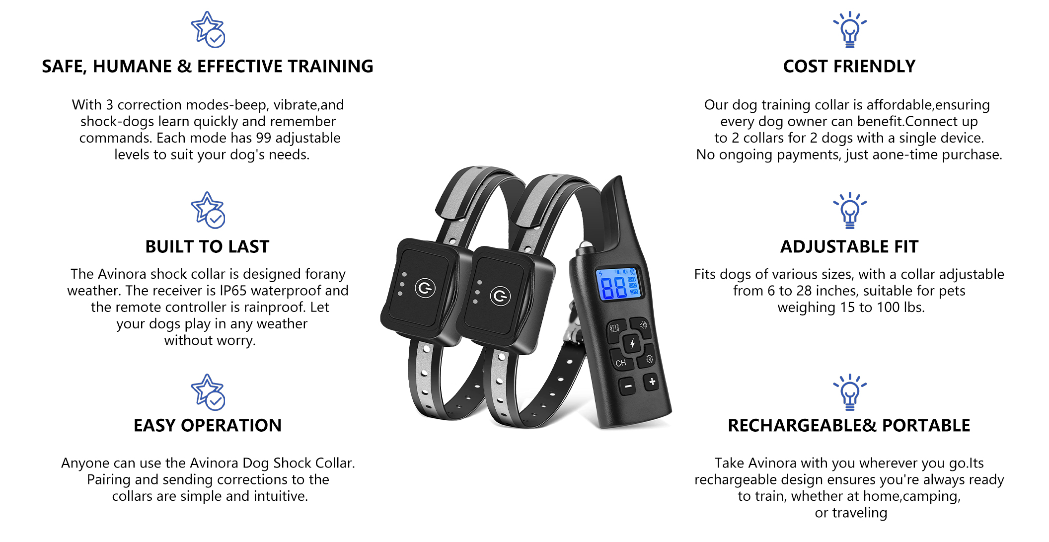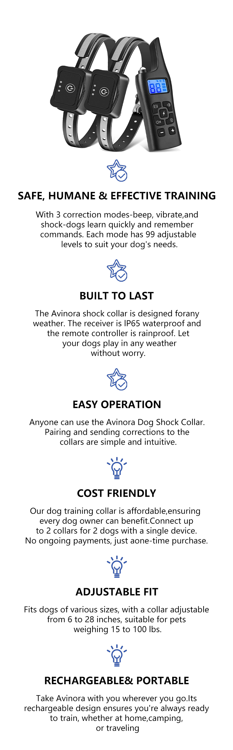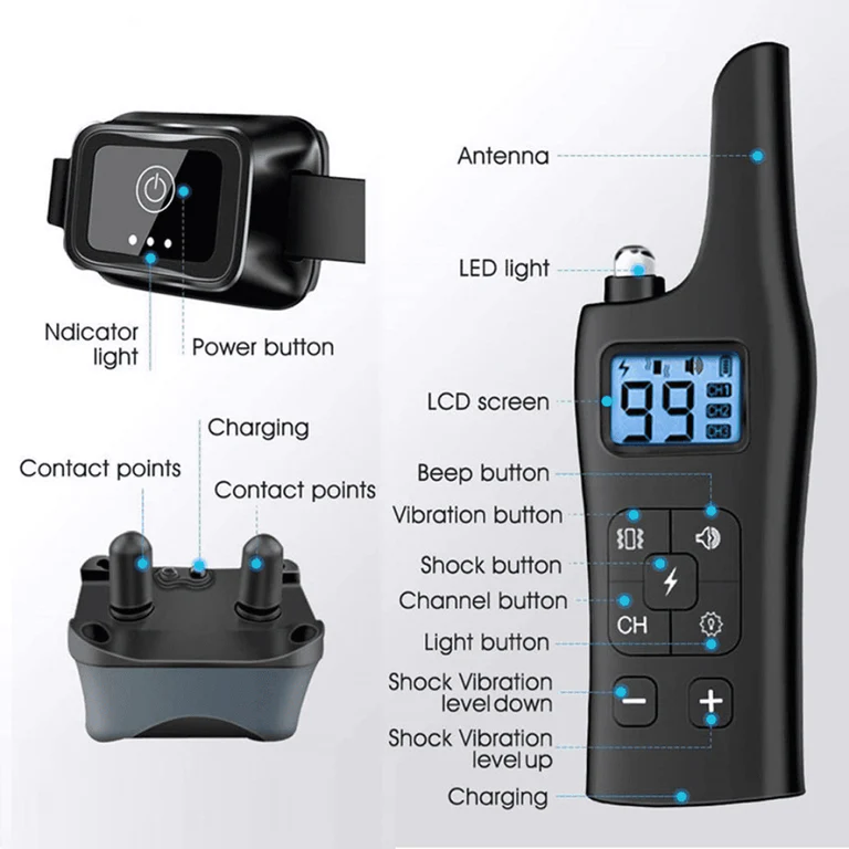 - Adjustable Intensity – 0–99 vibration levels and 0–9 shock levels let you tailor the training intensity for gentle, effective behavior correction.